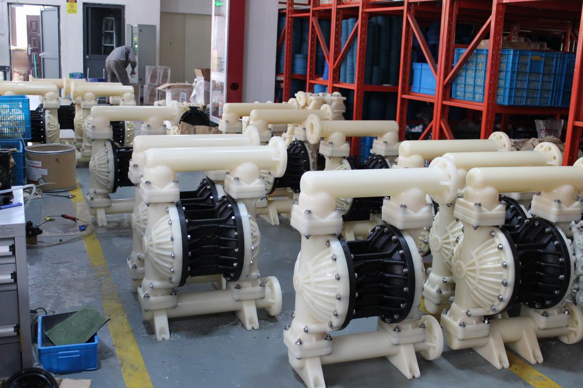 氣動隔膜泵其有四種材質:塑料、鋁合金、鑄鐵、不銹鋼。隔膜泵根據不同液體介質分別采用丁晴橡膠、氯丁橡膠、氟橡膠、聚四氟乙烯、聚四六乙烯。以滿足不同用戶的需要。安置在各種特殊場合,用來抽送種常規泵不能抽吸的介質,均取得了滿意的效果。